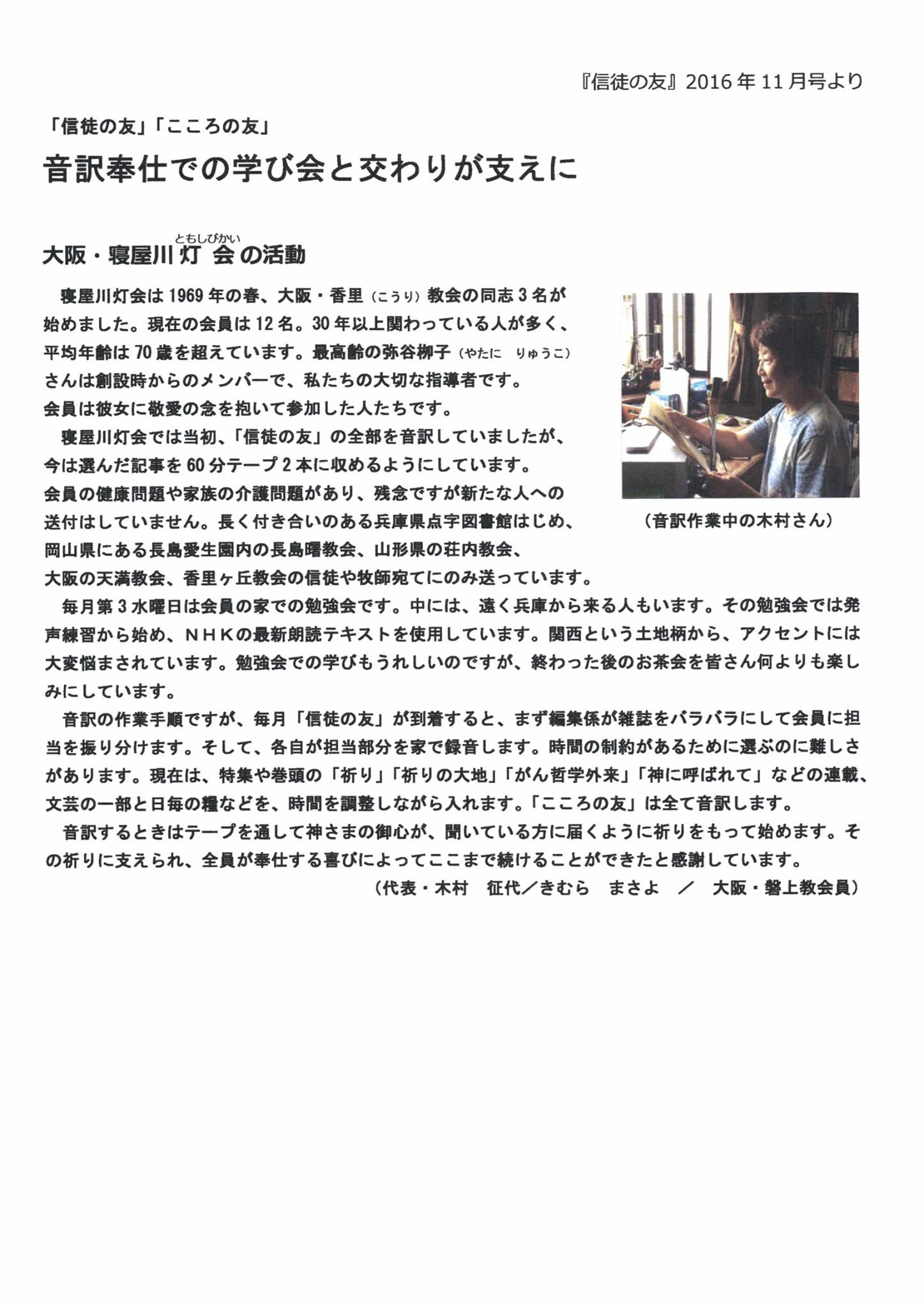 「信徒の友」11月号に磐上教会の姉妹の記事が掲載されました。